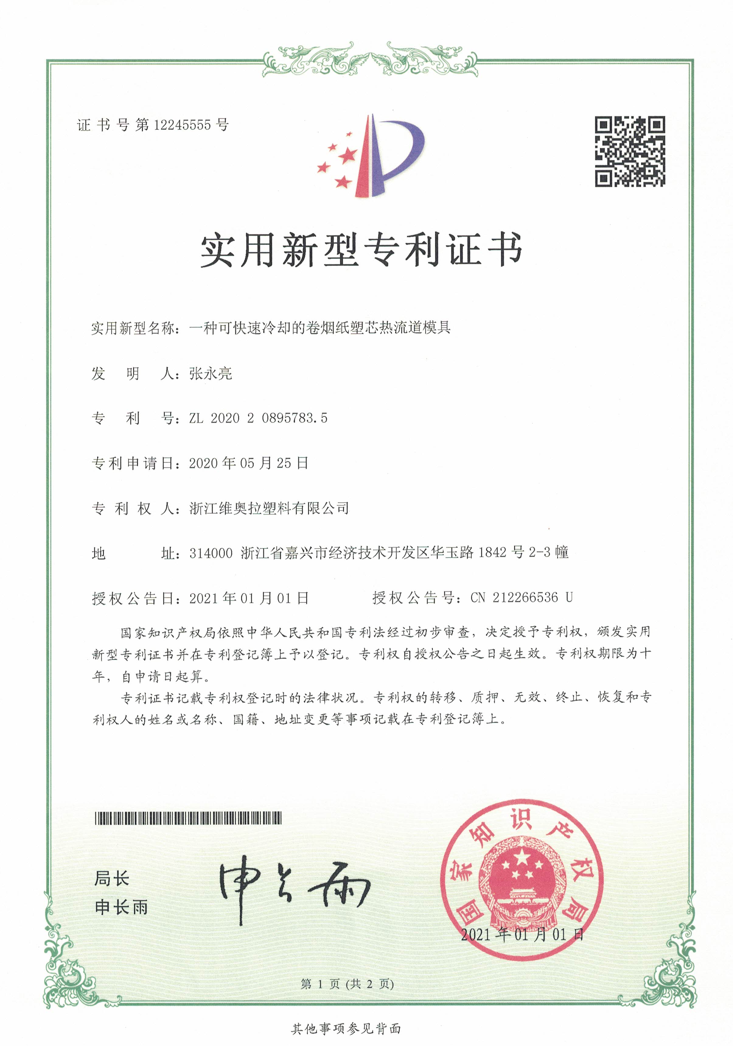2021年开年,公司成功拿到三份实用新型专利证书,这三项专利大大提升和巩固了公司核心竞争力,对公司今后的发展起到了积极推动作用。